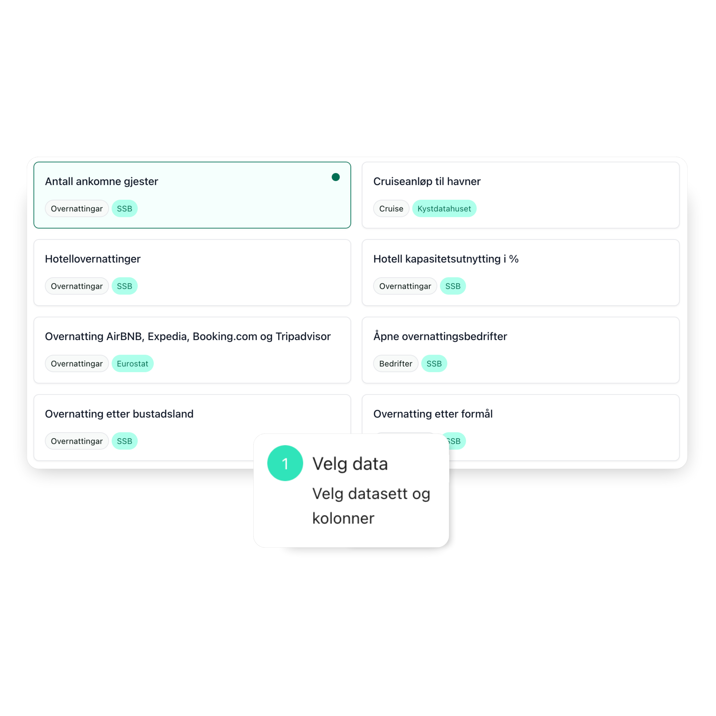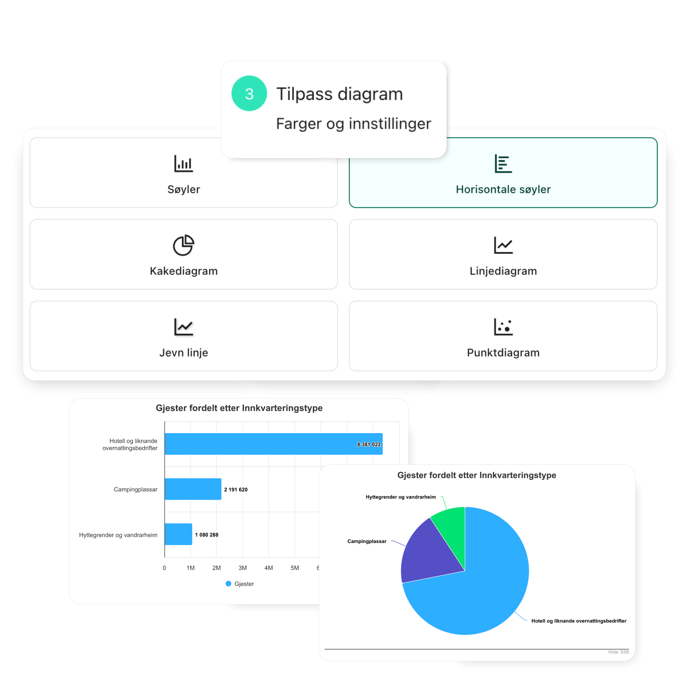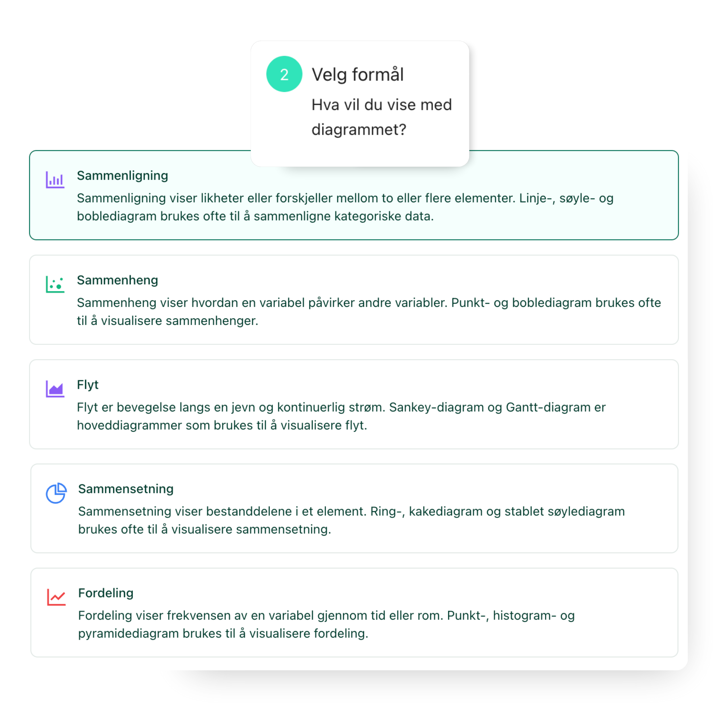 Før du velger diagramtype, får du en guide som hjelper deg å velge rett visualisering. Når du velger formål, foreslår vi diagramtypene som passer best, slik at dataene dine blir tydelige, presise og enkle å forstå.